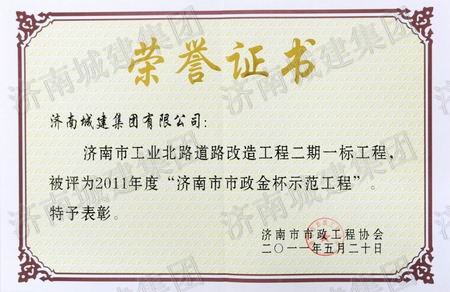 济南市工业北路道路改造工程一期四标工程被评为2011年度济南市市政金杯示范工程