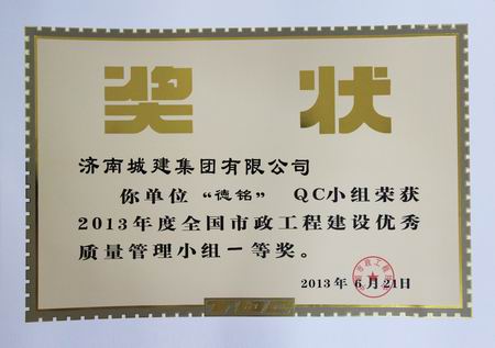 “德铭”QC小组荣获2013年度全国市政工程建设优秀质量管理小组一等奖