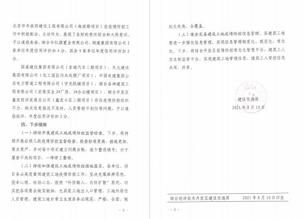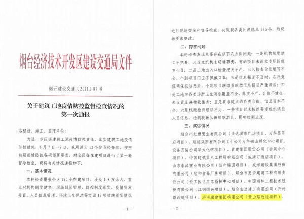 8月10日, , , ,,,,,烟台开发区建设交通局对一分公司烟台黄山路项目部的防疫工作予以通报表扬, , , ,,,,,充分肯定了项目部在此次防疫工作中的优秀表现。。。。。。