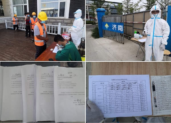 当烟台莱山区第一例南京关联病例确诊后, , , ,,,,,烟台黄山路项目部便紧急启动防疫应急预案, , , ,,,,,迅速对项目部管理人员及劳务队伍进行全面的行踪排查, , , ,,,,,同时组织全员进行核酸检测。。。。。。通过一日三次体温测量、宿舍消毒、全员签署《防控疫情责任书》、暂停施工、设立专职门卫严控人员进出等严格的防疫措施, , , ,,,,,有效预防了疫情在工地的发生。。。。。。同时, , , ,,,,,当收到烟台开发区临时隔离点缺乏封闭物资的消息后, , , ,,,,,项目部立刻安排人员筹备抗疫物资, , , ,,,,,第一时间送往临时隔离点, , , ,,,,,同时协助医务人员进行人员车辆的疏导, , , ,,,,,保证隔离点工作的有序进行。。。。。。