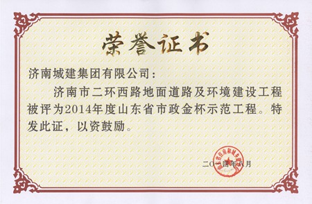 济南市二环西路地面道路及环境建设工程被评为2014年度山东省市政金杯示范工程