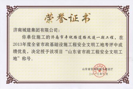 济南市辛祝路道路改造一期工程荣获2013年度山东省市政工程安全文明工地称号