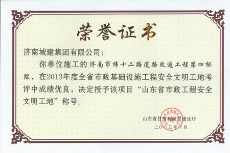济南市纬十二路道路改造工程第四标段济南市和平路道路改造工程第一标段荣获2013年度山东省市政工程安全文明工地称号