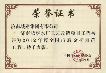 济南鹊华水厂工艺改造项目工程被评为2012年度全国市政金杯示范工程