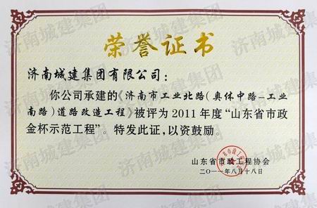 济南市工业北路(奥体中路—工业南路)道路改造工程被评为2011年度山东省市政金杯示范工程