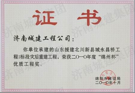 山东省援建北川新县城永昌桥工程Ⅰ标段灾后重建工程荣获2010年度绵州杯优质工程奖