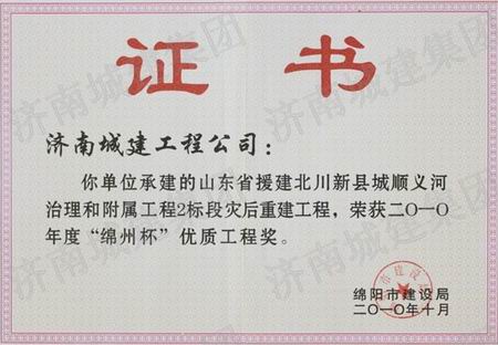 山东省援建北川新县城顺义河治理和附属工程2标段灾后重建工程荣获2010年度绵州杯优质工程奖