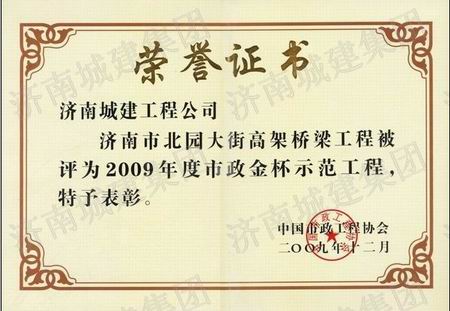济南市北园大街高架桥梁工程被评为2009年度全国市政金杯示范工程