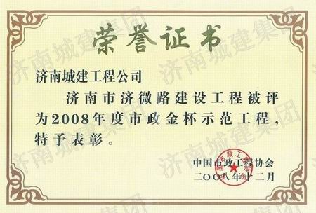 济南市济微路建设工程被评为2008年度全国市政金杯示范工程