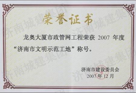 龙奥大厦市政管网工程荣获2007年度“济南市文明示范工地”称号