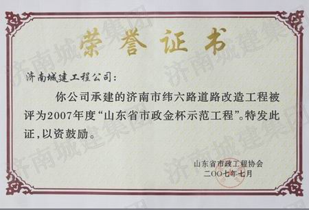 济南市纬六路道路改造工程被评为2007年度山东省市政金杯示范工程