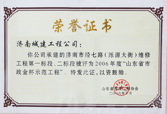 济南市经七路(泺源大街)维修工程第一、二标段被评为2006年度山东省市政金杯示范工程