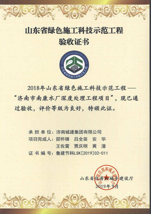济南市南康水厂深度处理工程项目被评为2018年山东省绿色施工科技示范工程