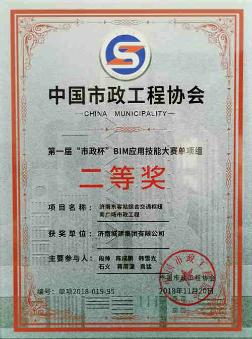 集团《济南东客站交通枢纽南广场市政工程BIM应用实践》荣获“第一届市政杯BIM应用技能大赛单项组二等奖”