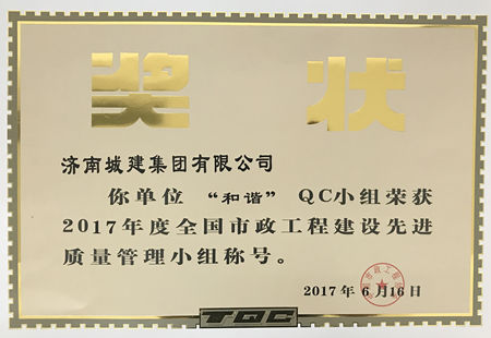 “和谐”QC小组荣获2017年度全国市政工程建设先进质量管理小组称号
