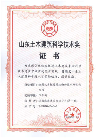 涂覆抗车辙防滑路面新技术研究与应用获山东土木建筑科学技术奖二等奖