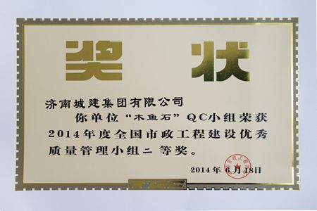“木鱼石”QC小组荣获2014年度全国市政工程建设优秀质量管理小组二等奖